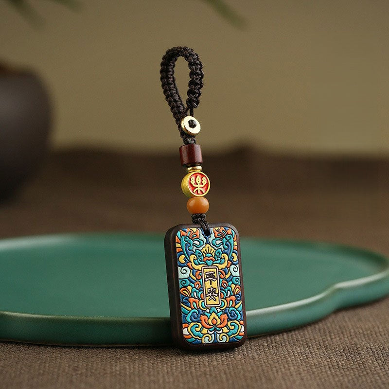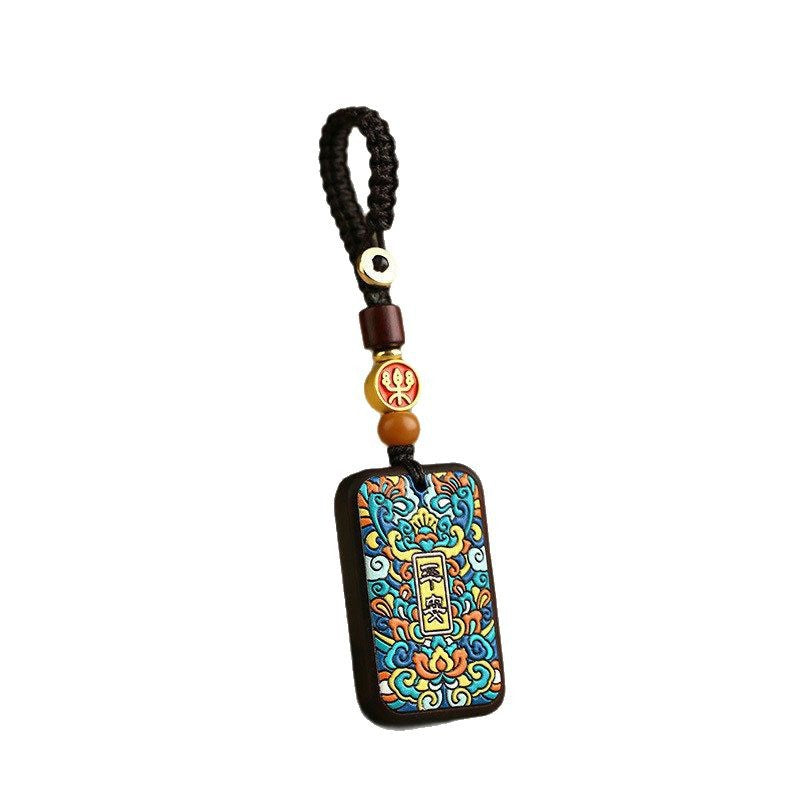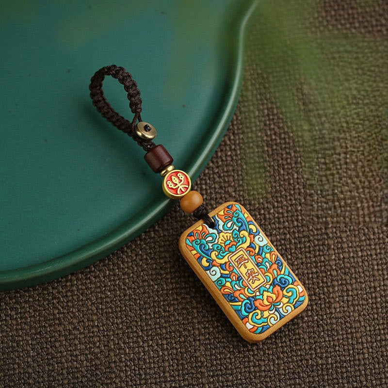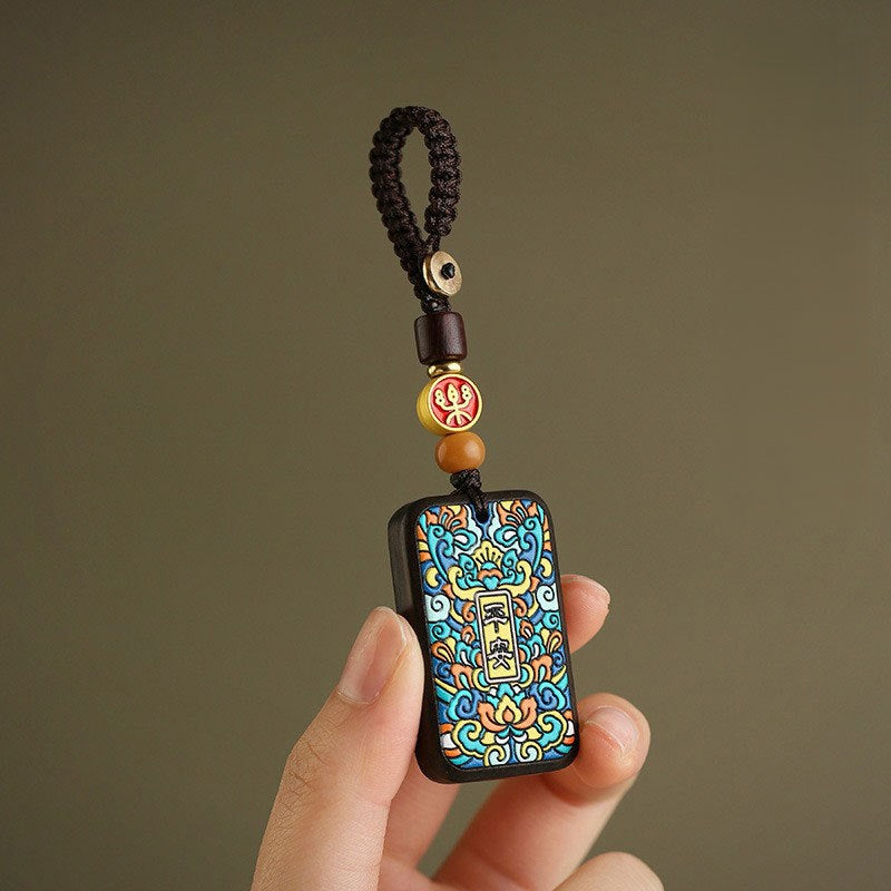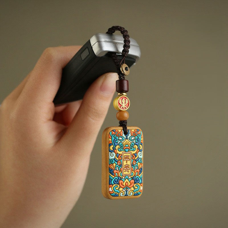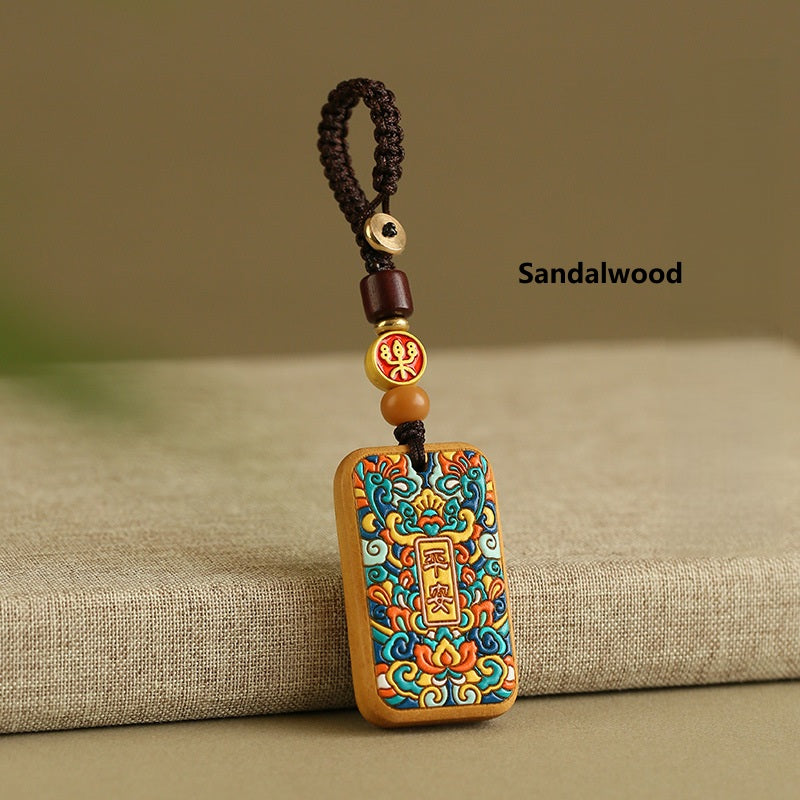 Crafted from natural sandalwood, known for its calming aroma and spiritual properties, this keychain features a hand-painted "Peace Talisman" (Wu Shi Pai). In Chinese culture, the blank "Wu Shi" tablet symbolizes a smooth life free of troubles, making it a powerful emblem for safety and peace.