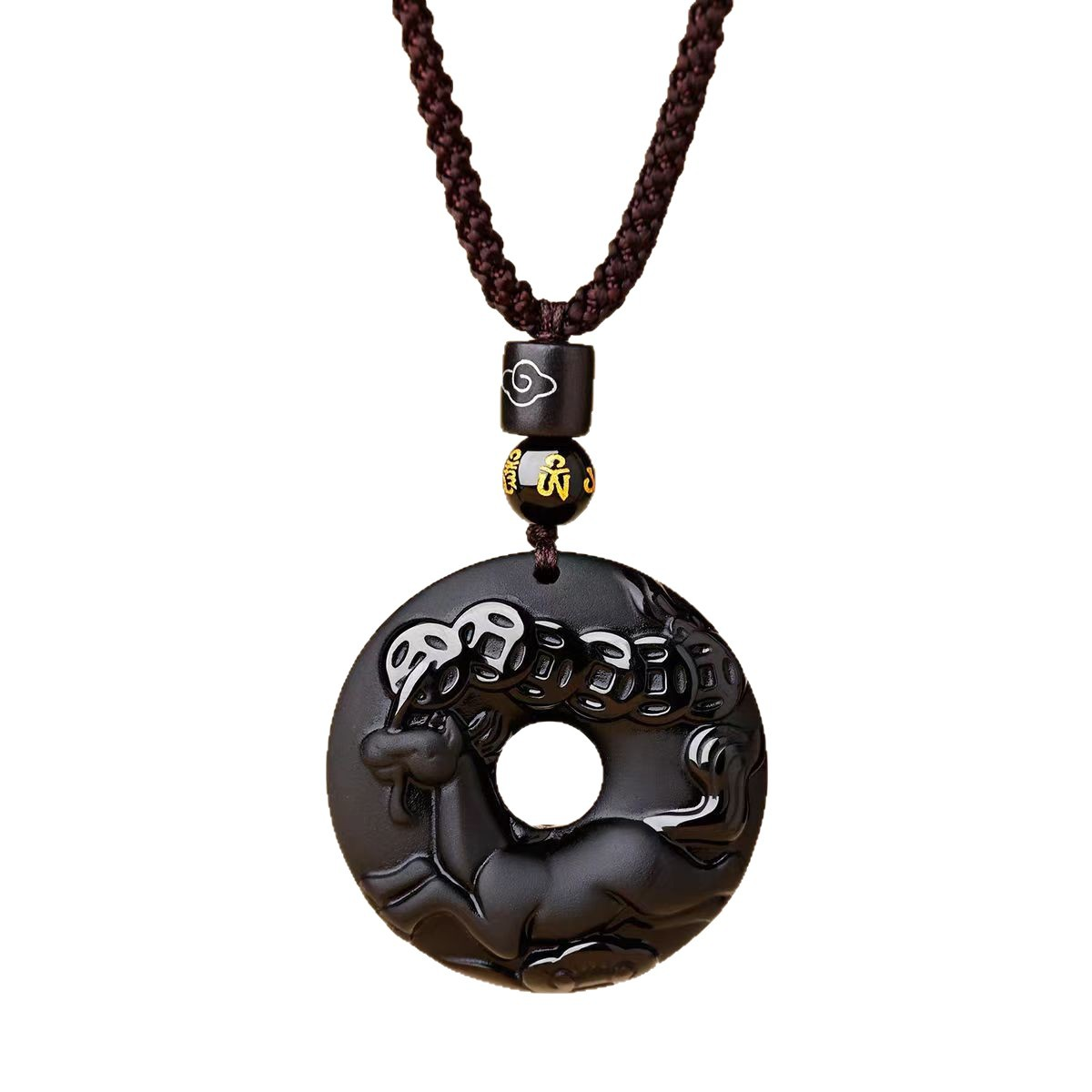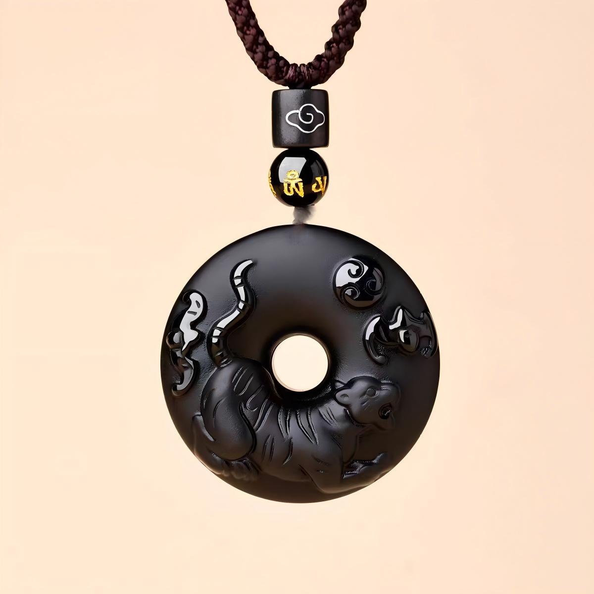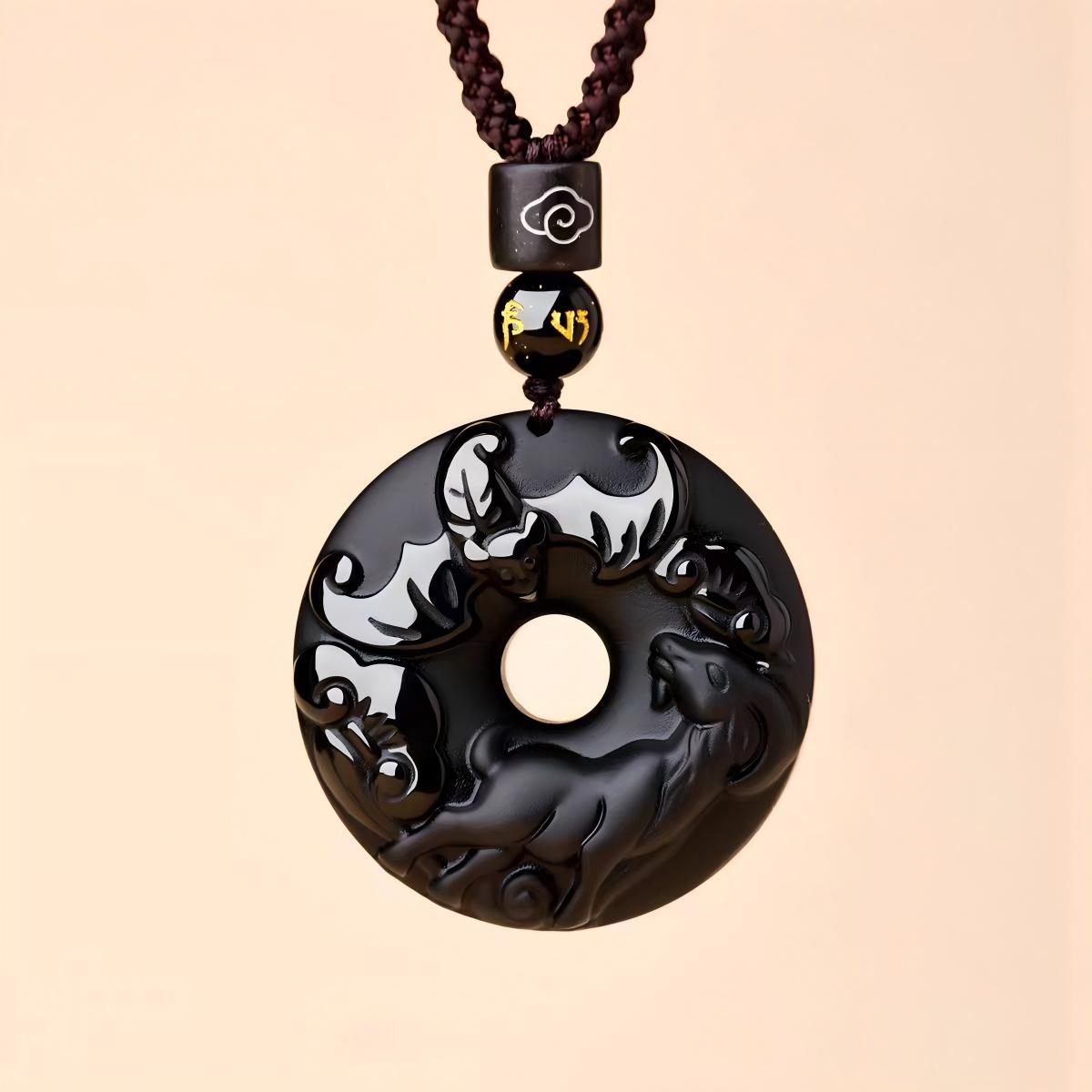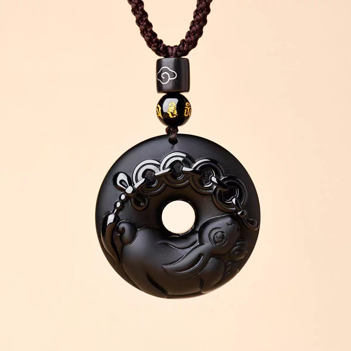 This pendant reimagines the traditional Ping An Kou (“Peace Button”)—a symbol of wholeness, safety, and unbroken harmony—in powerful natural black obsidian. Formed from volcanic glass, black obsidian is prized in Feng Shui and Daoist practice for its ability to absorb negativity, shield against psychic intrusion, and ground turbulent emotions. At its base, a finely engraved or attached charm represents your birth-year zodiac animal (Rat through Pig), aligning the amulet with your unique life path and celestial guardian.